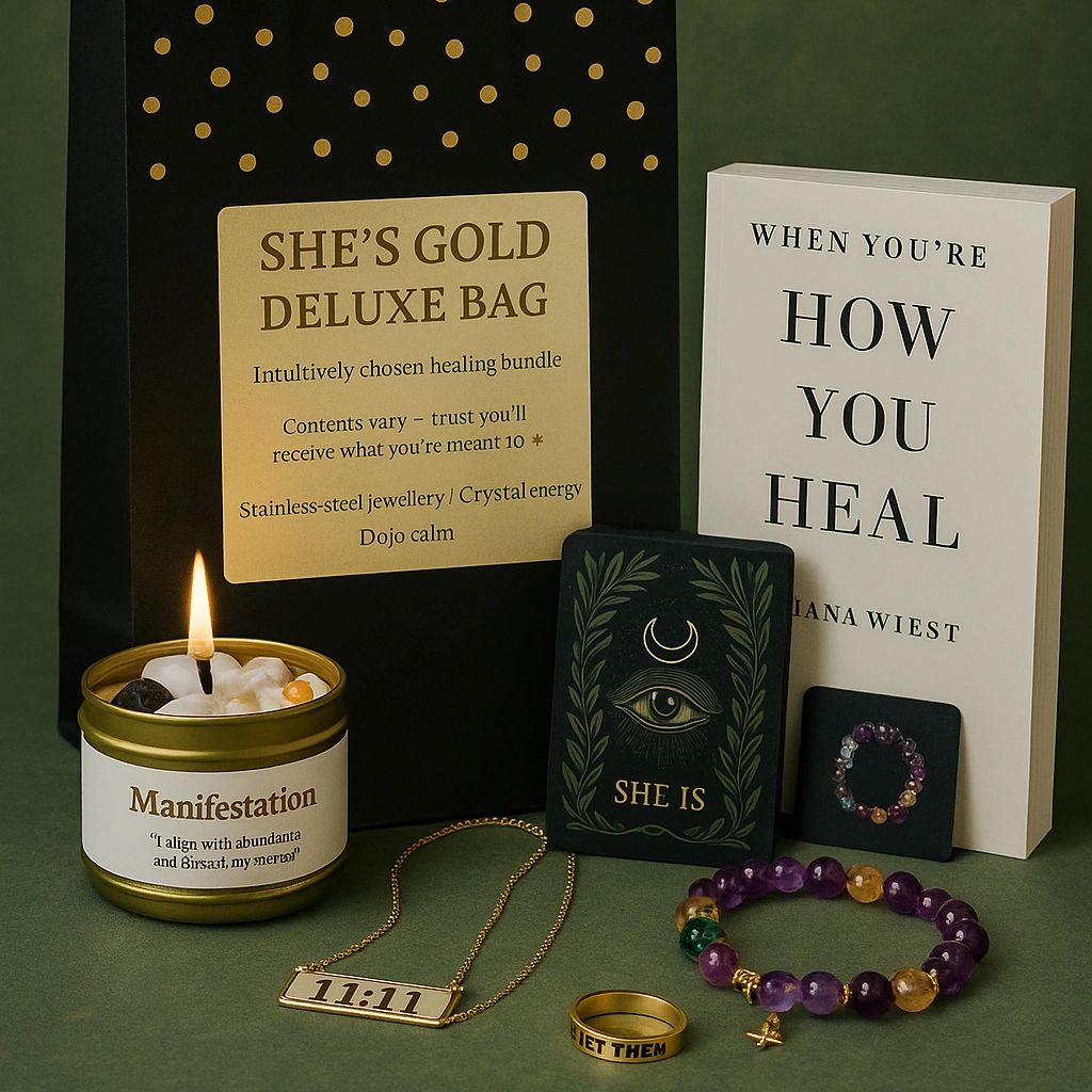Each She’s Gold Deluxe Bag is a hand-curated collection of healing tools chosen with love and intention. From candles and crystals to affirmation cards and mindful keepsakes, every item carries a little piece of calm.